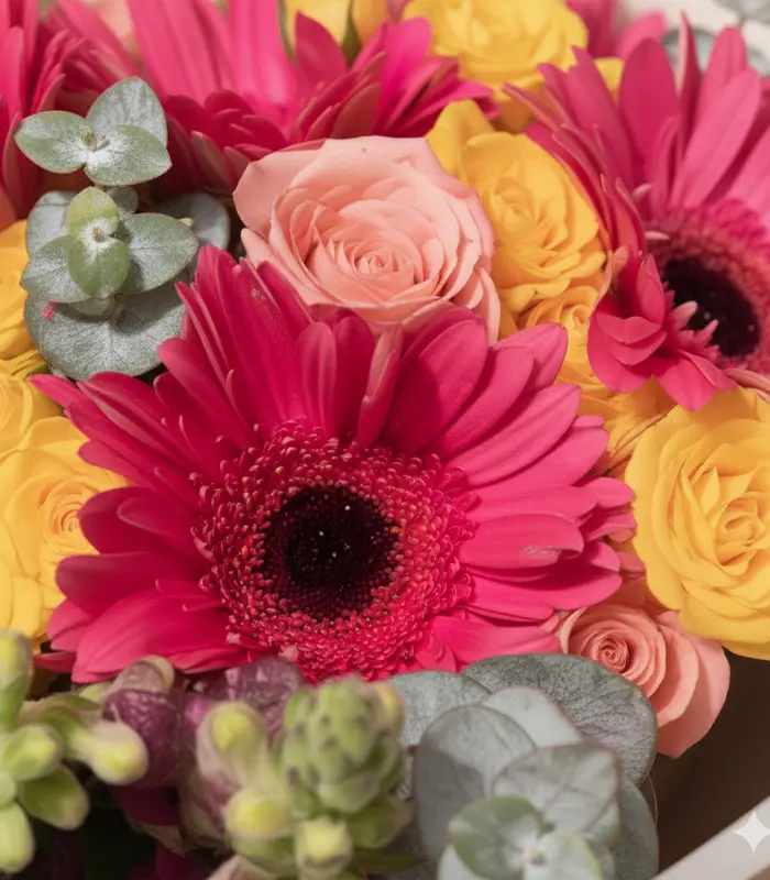 Un bouquet precioso para regalar a esa personita especial. Lleno de color en tonos pastel, con gérberas, rosas y más flores ecuatorianas.